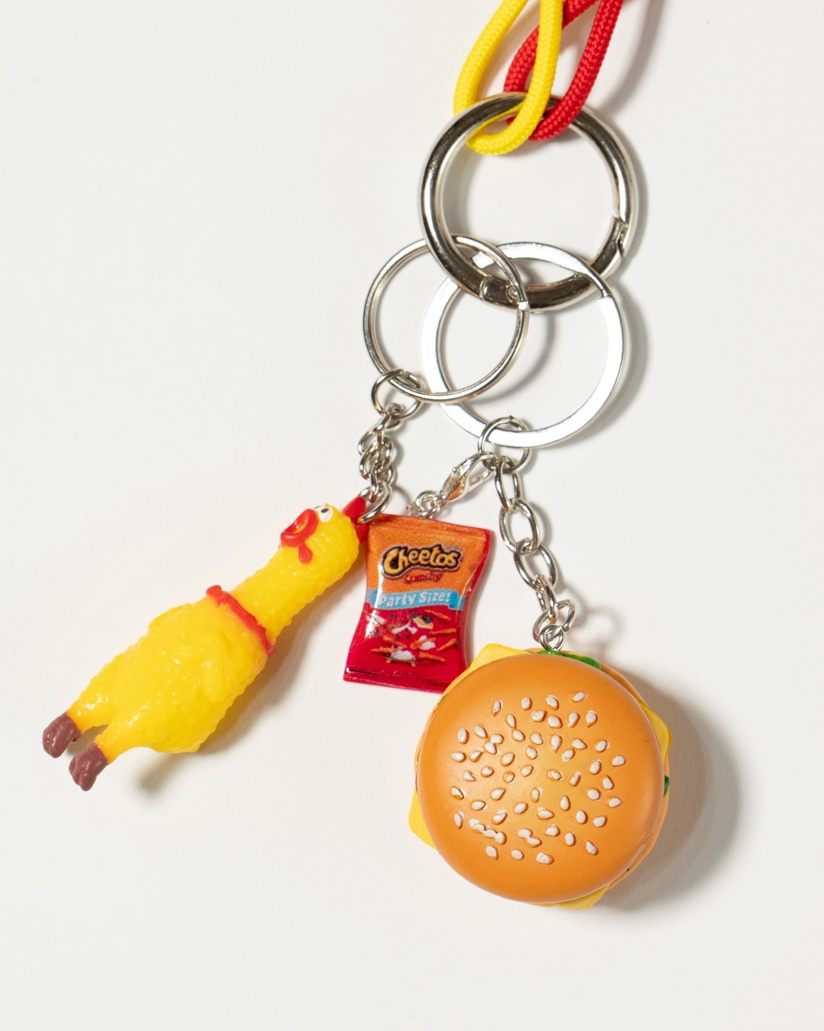 ハンバーガー、スナック、ラバーチキンなど日常的でユニークなモチーフを組み合わせています。